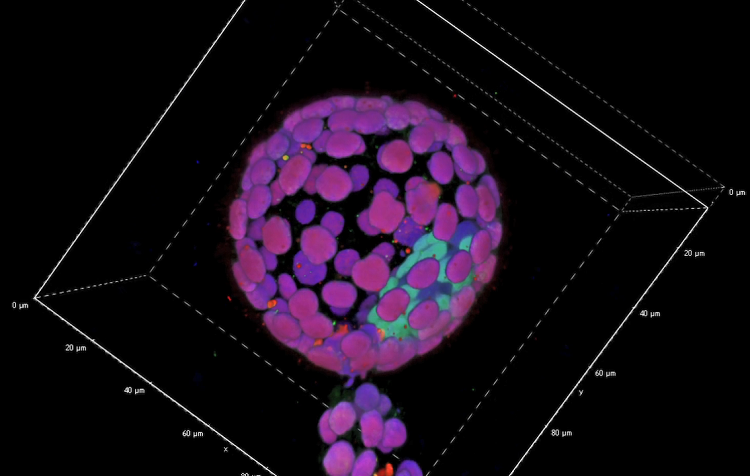三维影像重建:观察老鼠囊胚里胚层细胞分布的状况,可以看到囊胚内部是中空的。绿色:原始内胚层marker:GATA4;红色:滋养外胚层marker:CDX2;蓝色:细胞核,RCM1成像。