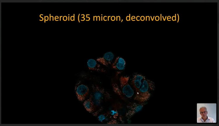 三维影像重建:观察肿瘤球。蓝色:细胞核,RCM成像,去卷积处理。