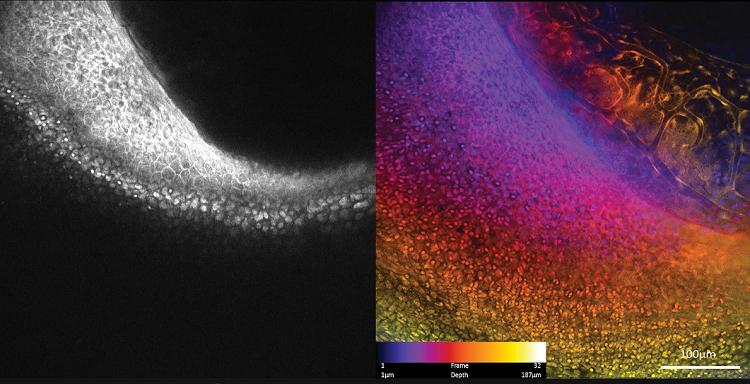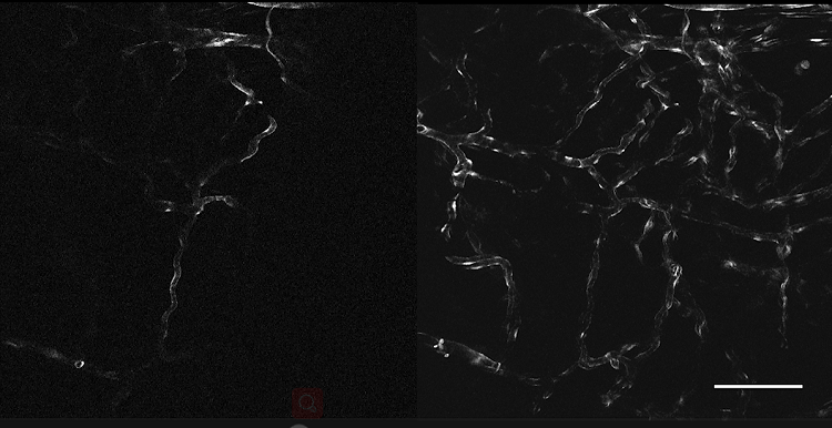 左:成像深度:250 μm,表达GFP的斑马鱼血管内皮成像;