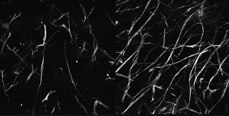 左:ACL中有序的胶原纤维;右:ACL中过度负荷后的无序胶原纤维。